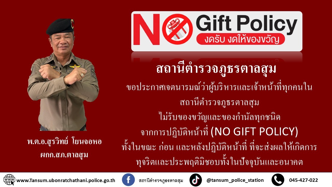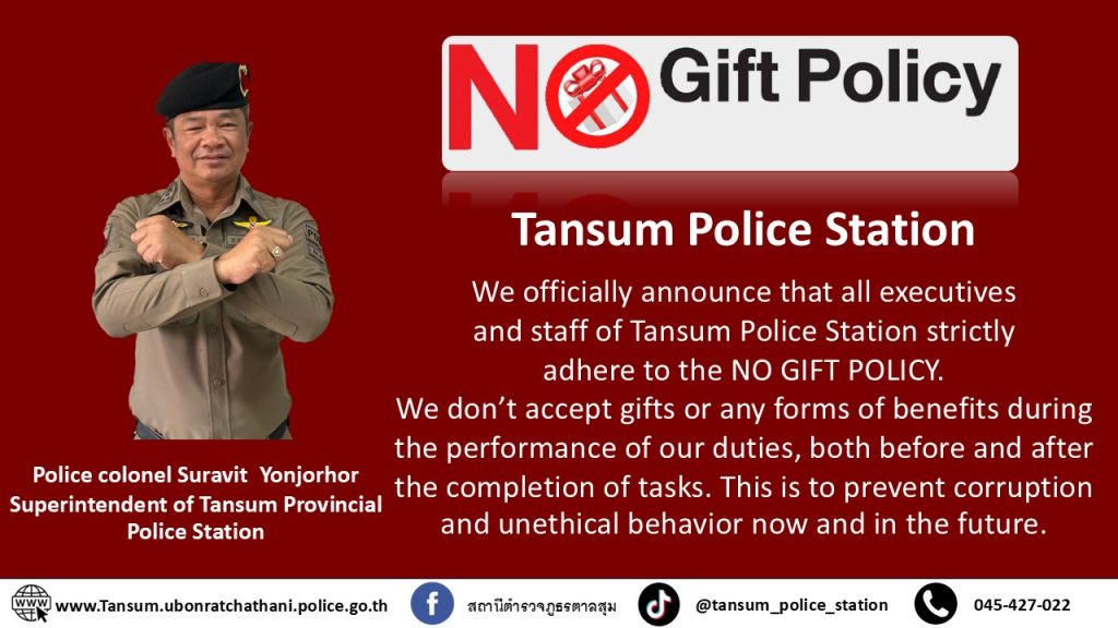 ประกาศ สถานีตำรวจภูธรตาลสุม เรื่อง นโยบายต่อต้านการรับสินบน No Bribery Policy และการไม่รับของขวัญของ