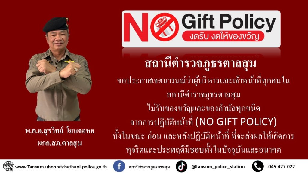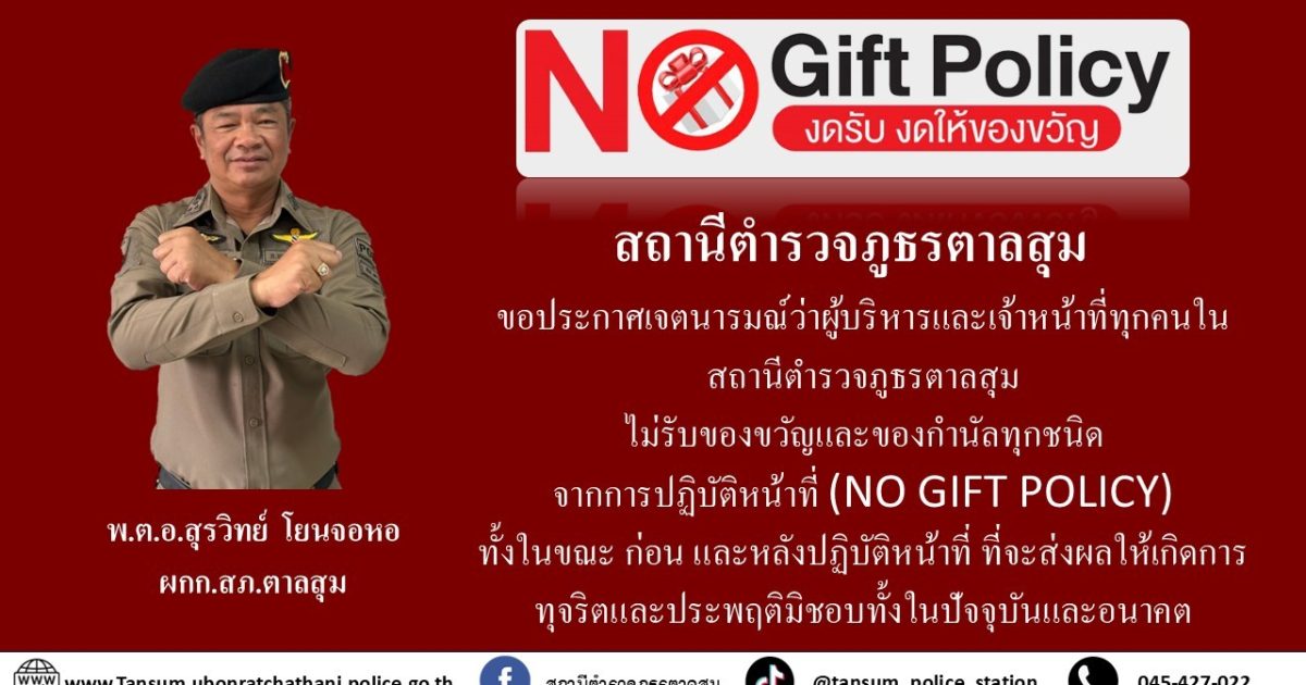 ประกาศ สถานีตำรวจภูธรตาลสุม เรื่อง นโยบายต่อต้านการรับสินบน No Bribery Policy และการไม่รับของขวัญของกำนัลหรือประโยชน์อื่นใด (์No Gift Policy) ลงวันที่ 14 มกราคม 2568 ให้มีความสอดคล้องและครอบคลุมประเด็นในการเสริมสร้างคุณธรรมและความโปร่งใส และต่อต้านการทุจริต/ต่อค้านการรับสินบนในหน่วยงาน